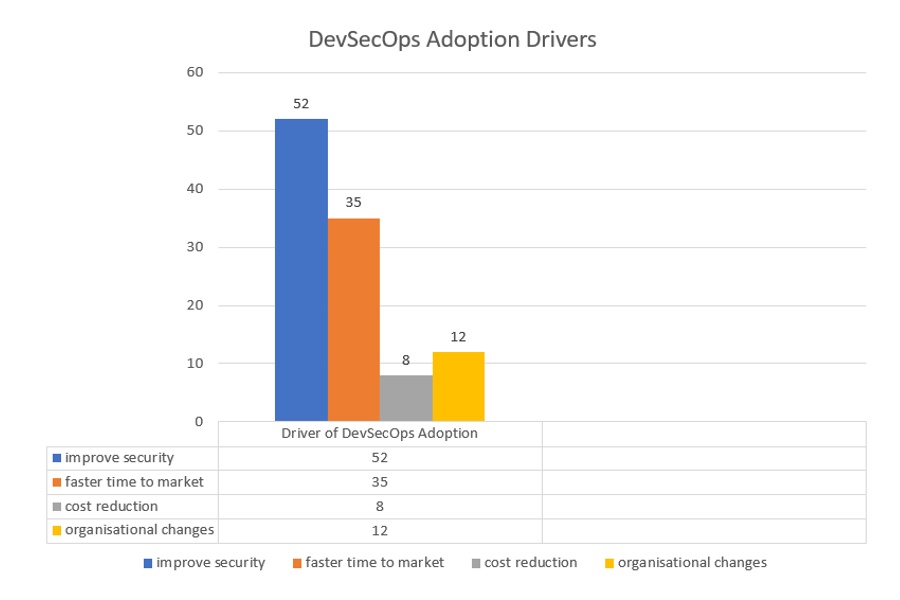 The chart below illustrates the various drivers to adopt the DevSecOps. These findings demonstrate the alignment of improved security as a top priority for DevSecOps enablement.